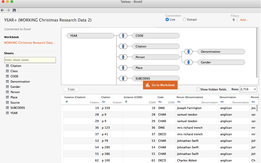 Each field is connected to other fields by a set of common variables. Some fields are linked to one another by a shared ‘instance’. (Instance 1 might have a ‘CODE’ of ‘DINE’ and in another field have a ‘PERSON’ of ‘William Bagshawe.) Other fields are linked together by a shared ‘person.’ (‘William Bagshawe’ might have an entry in the ‘gender’ field: male.)