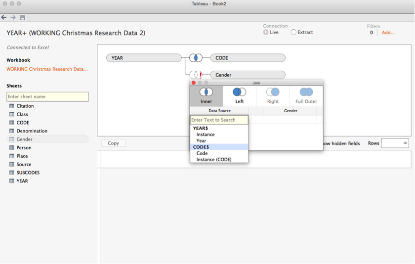 Notice a few things here. ‘YEAR’ and ‘CODE’ are connected by a little venn diagram symbol. This means that there is a join between them—in other words, the sheet is reading the different fields as connected. Imagine this is the ‘year’ field: