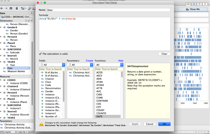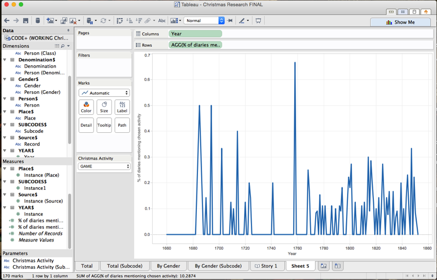 This tells Tableau this: count the distinct number of instances where the field code is equal to the Christmas Activity I’ve selected from my dropdown menu. Then divide this by the total number of distinct entries. (Giving us the particular Christmas activity expressed as a percentage of total activities for each year.) Name this calculated field something descriptive—mine is called ‘% of diaries mentioning activity.’ Now drag it to ‘rows.’